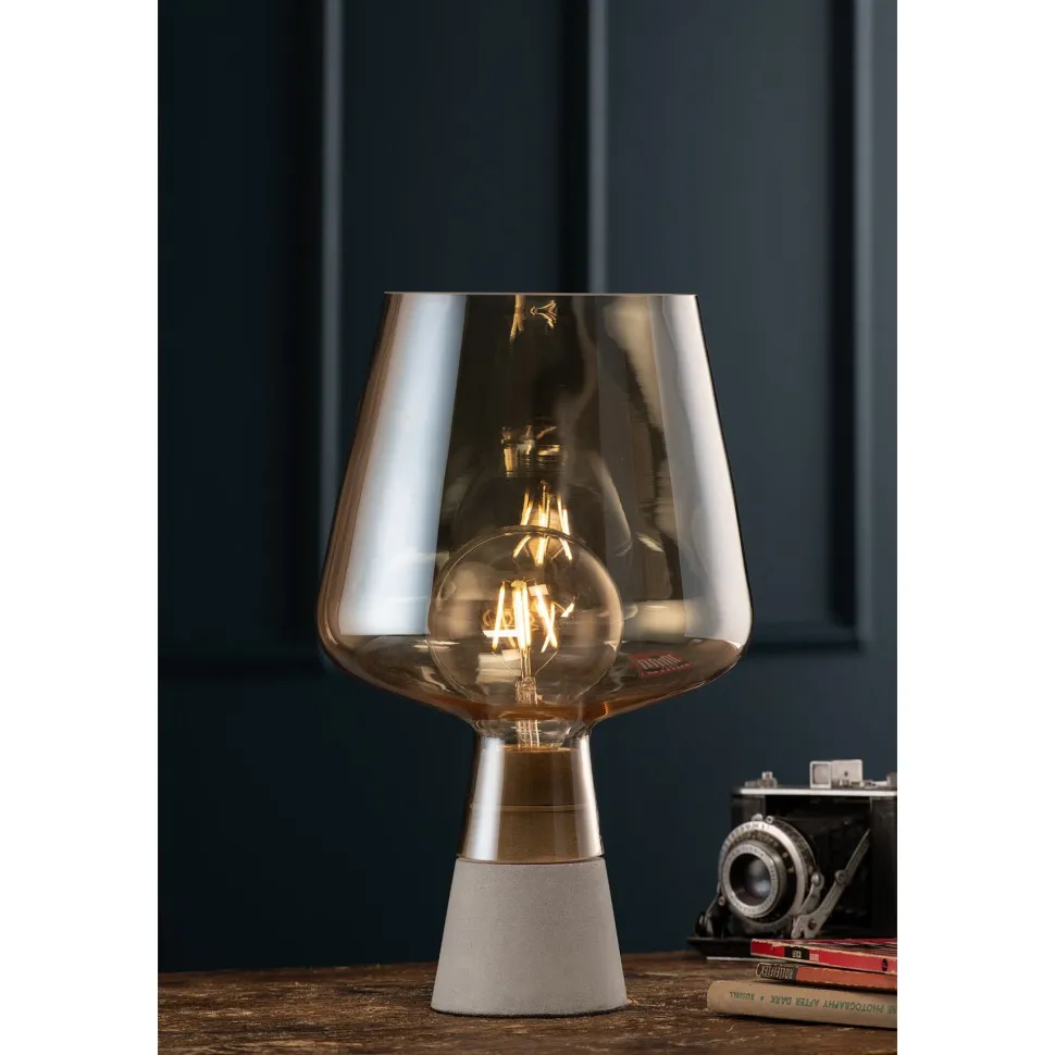 This spectacular lamp combines modern materials and forms. A tulip shaped glass shade in amber creates a warm glow, adding atmospheric lighting to any space, and reveals a large spherical edison style LED bulb. Mounted on a slim concrete base, this lamp has an undoubtedly modern form factor.