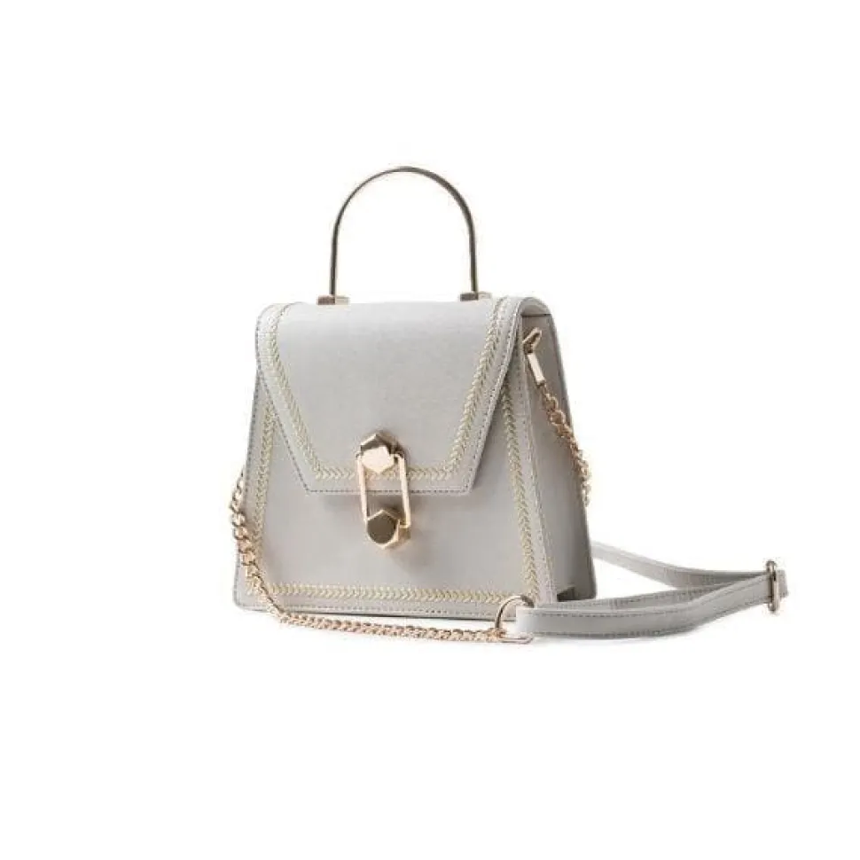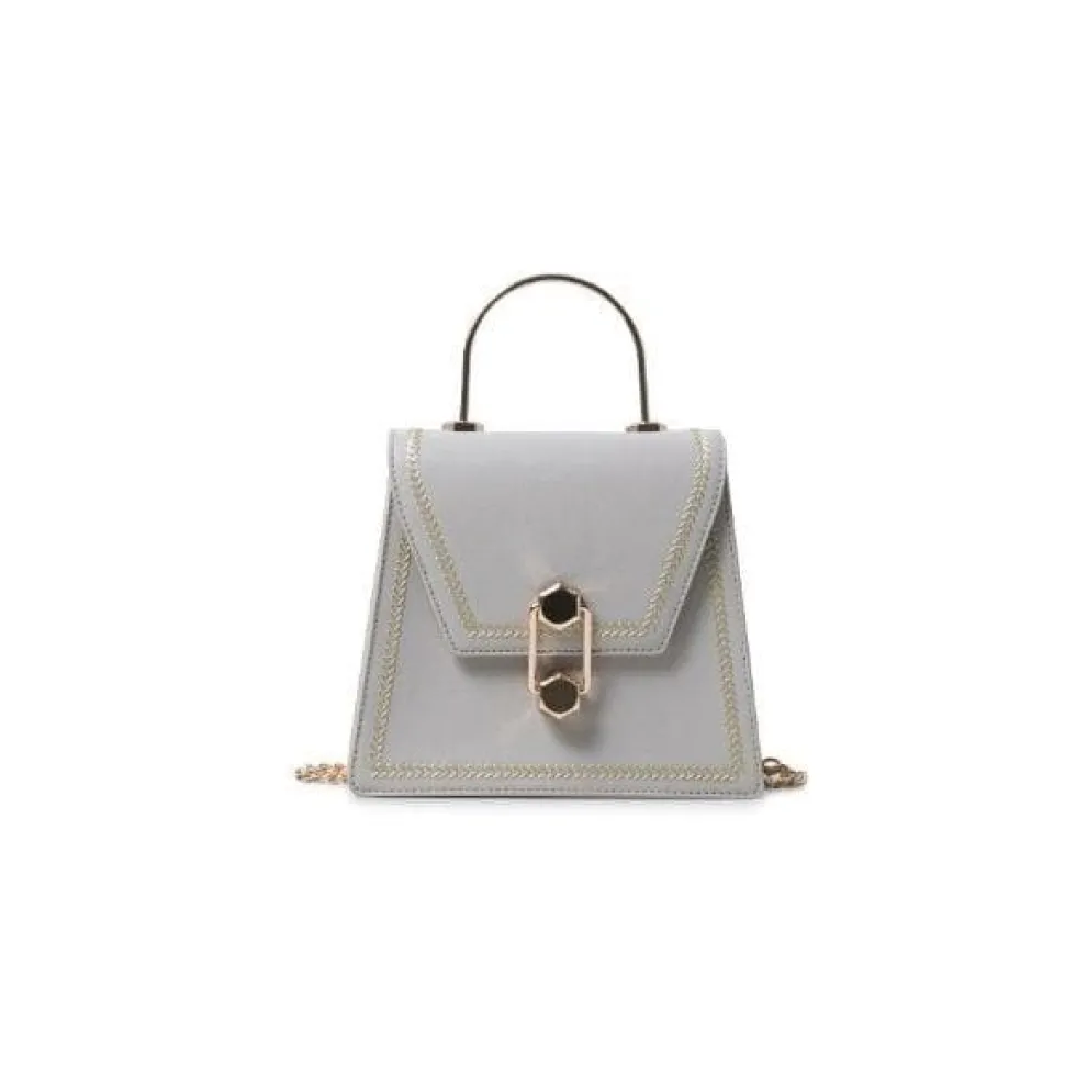 Our beautiful Top Handle Warm Grey Bag Shouts Class and Elegance with it’s unique style and shape. This bag has a slim gold top handle for carrying or can be worn over the shoulder using the detachable chain and leather strap, instantly taking you from one look to another. The added touch of the gold hardware and intricate stitching makes for a very sophisticated bag. This compact option is ideal for nights out or city adventures!